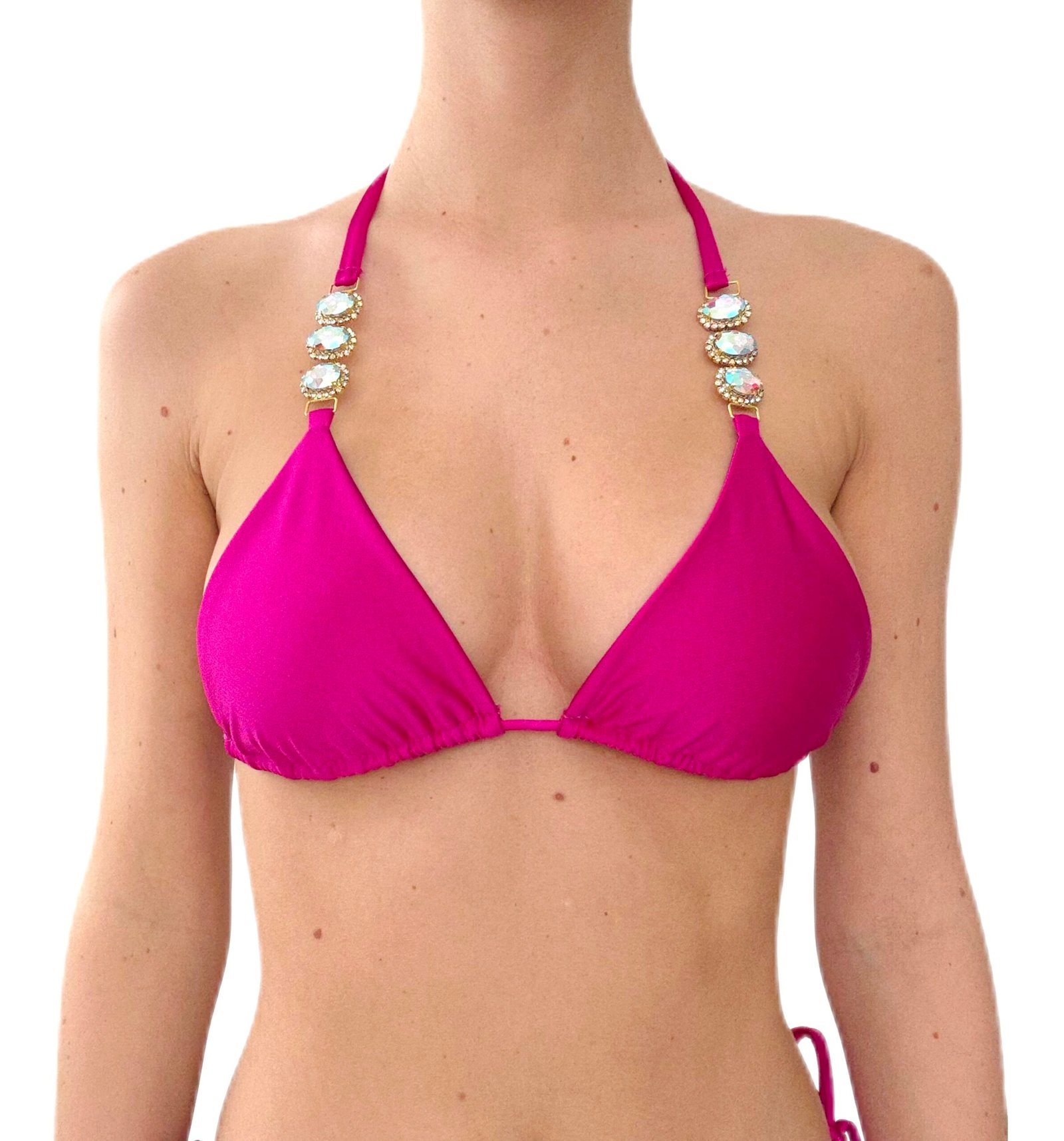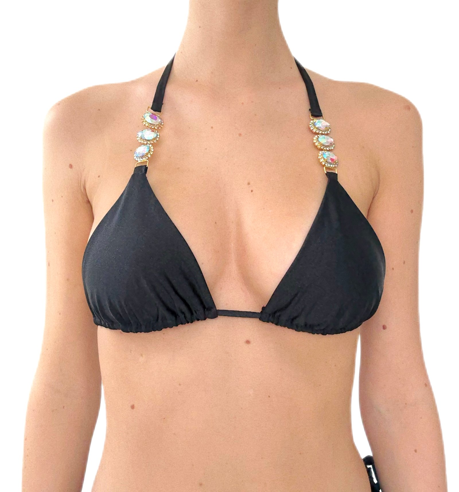 - Pair with a sheer white sarong or linen kaftan to showcase the crystal accents.