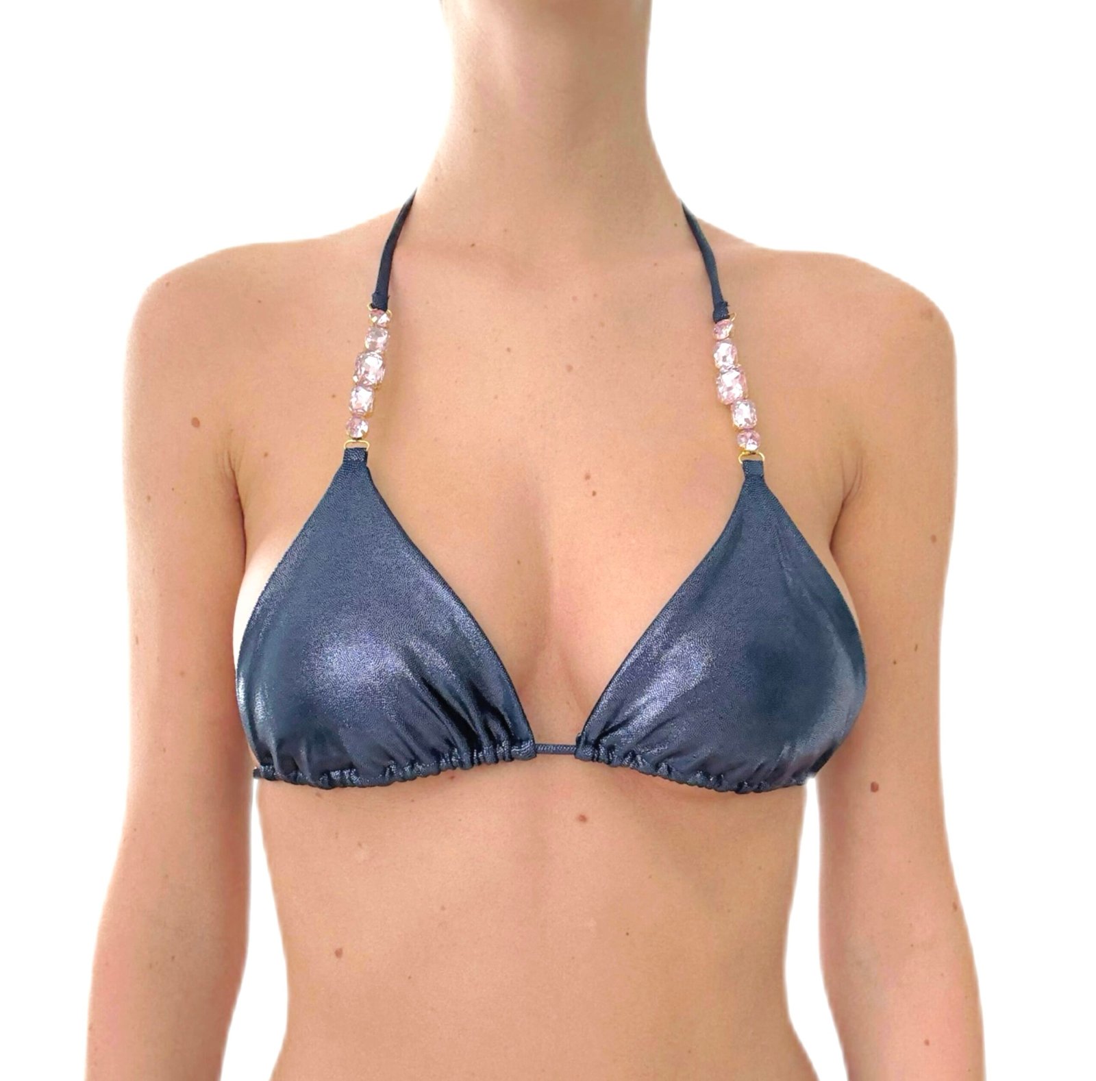 The Sardinia Rose Metallic Aqua features premium stretch swim fabric with adjustable straps and tie closures for a personalized fit.